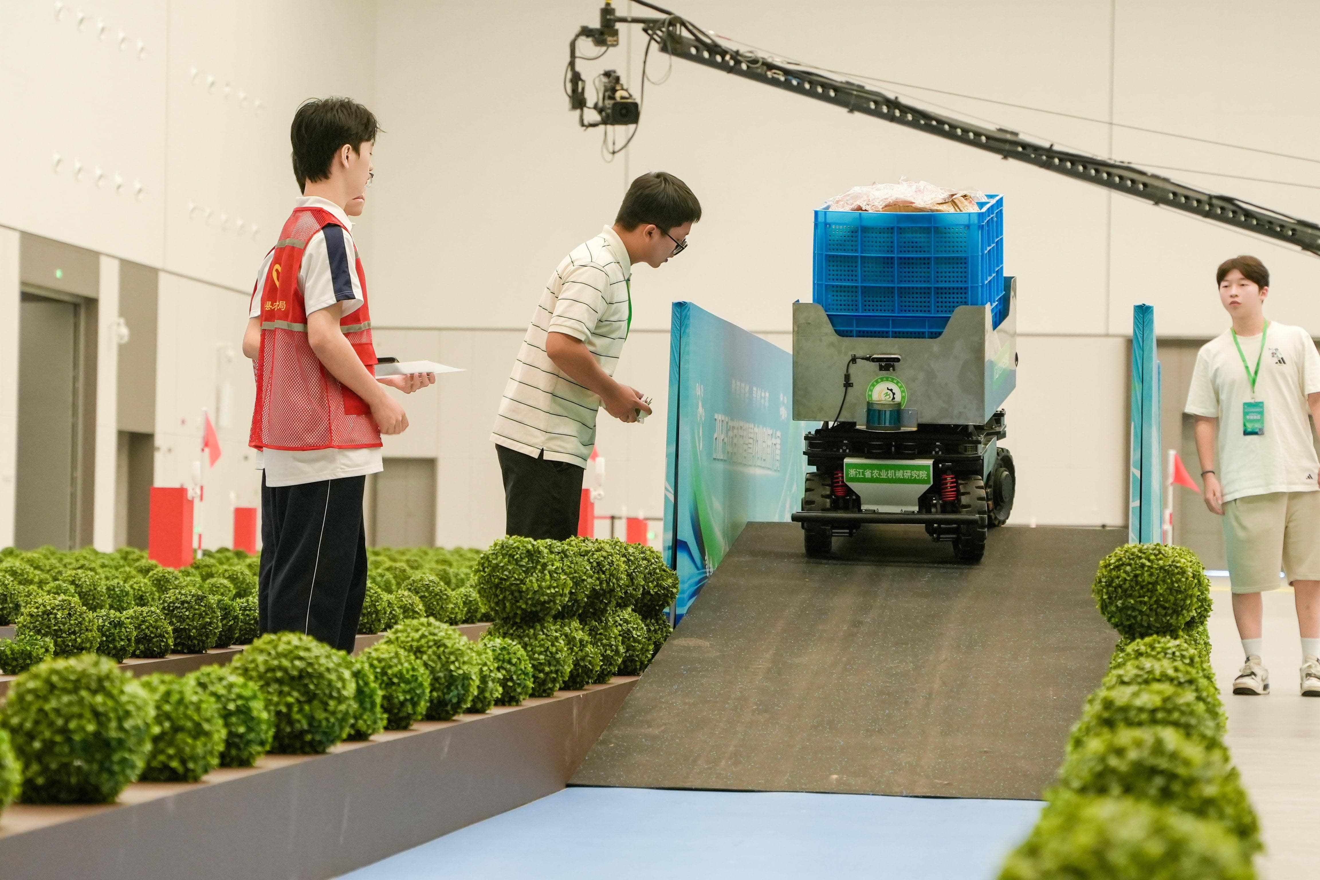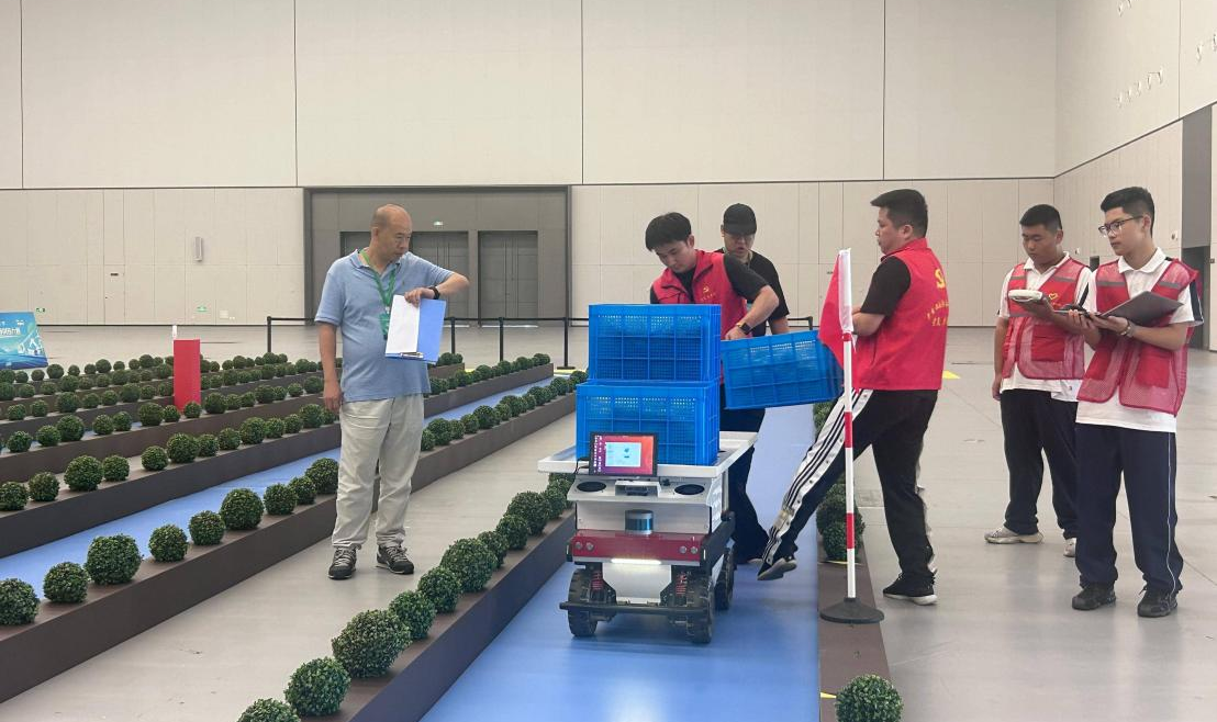 温室搬运机器人赛道主裁判、浙江省农业科学院数字农业研究所副所长孔德栋进一步向记者介绍,机器人每到一个任务点,需自主停靠20秒,由工作人员将载重25公斤的搬运筐稳妥放置于机器人上,随后继续行进至下一任务点,直到完成4个搬运筐搬运任务。到达终点前,机器人需负重100公斤通过长度10米、坡度10度的坡道,完成爬坡越障任务。