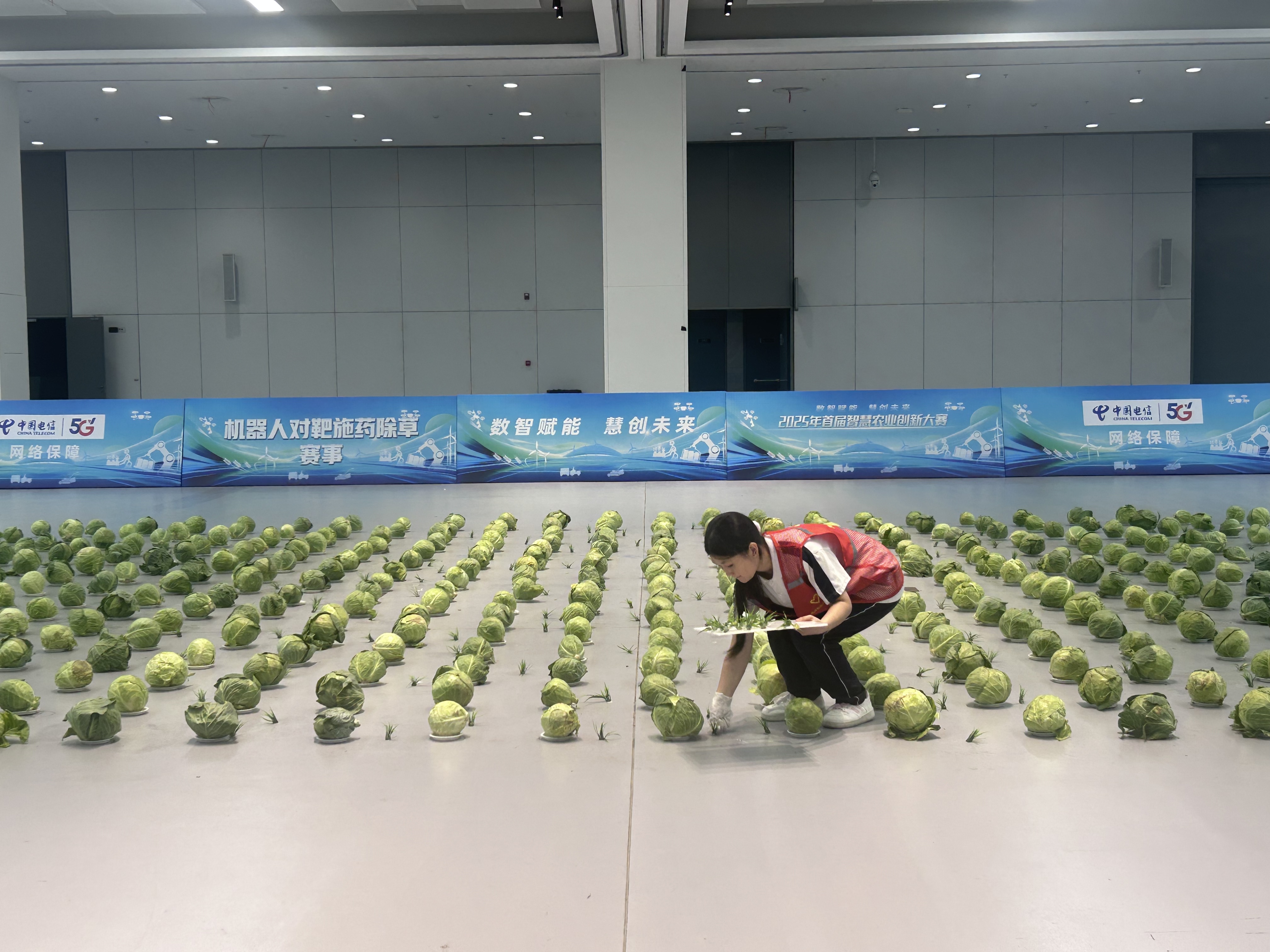 离开温室搬运机器人赛场,对靶施药除草机器人赛场同样精彩纷呈。对靶施药除草机器人比的是看谁更精准识别农作物和杂草,并进行精准施药。偌大的赛场内,圆滚滚的卷心菜分列16行整齐排列在40米长、10米宽的作业区内,其间还随机放有杂草以模拟真实的农田场景。