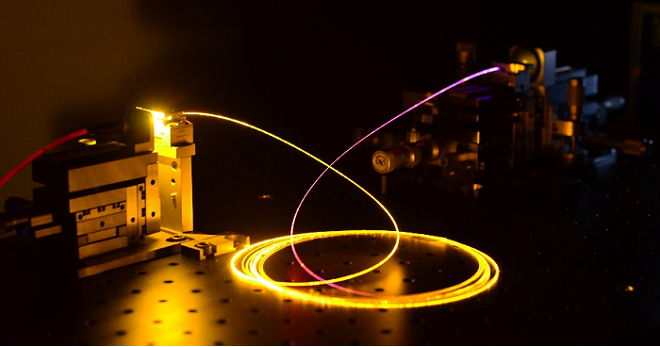 超连续谱是指强激光脉冲在非线性光纤中传输时,由于自相位调制、孤子自频移、拉曼四波混频,调制不稳定性、高次谐波等多种非线性效应的共同作用,所产生的光谱剧烈展宽的现象。如下图所示,光谱沿传输方向展宽,导致光纤不同的部位呈现出不同的颜色。