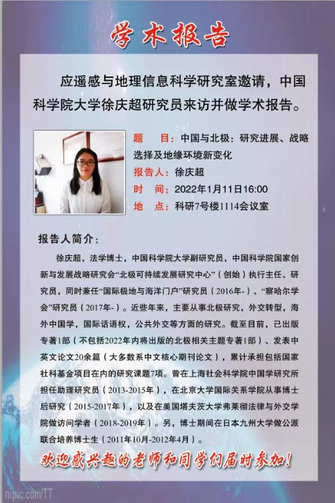 应遥感与地理信息科学研究室邀请,中国科学院大学徐庆超研究员来访并作学术报告。
