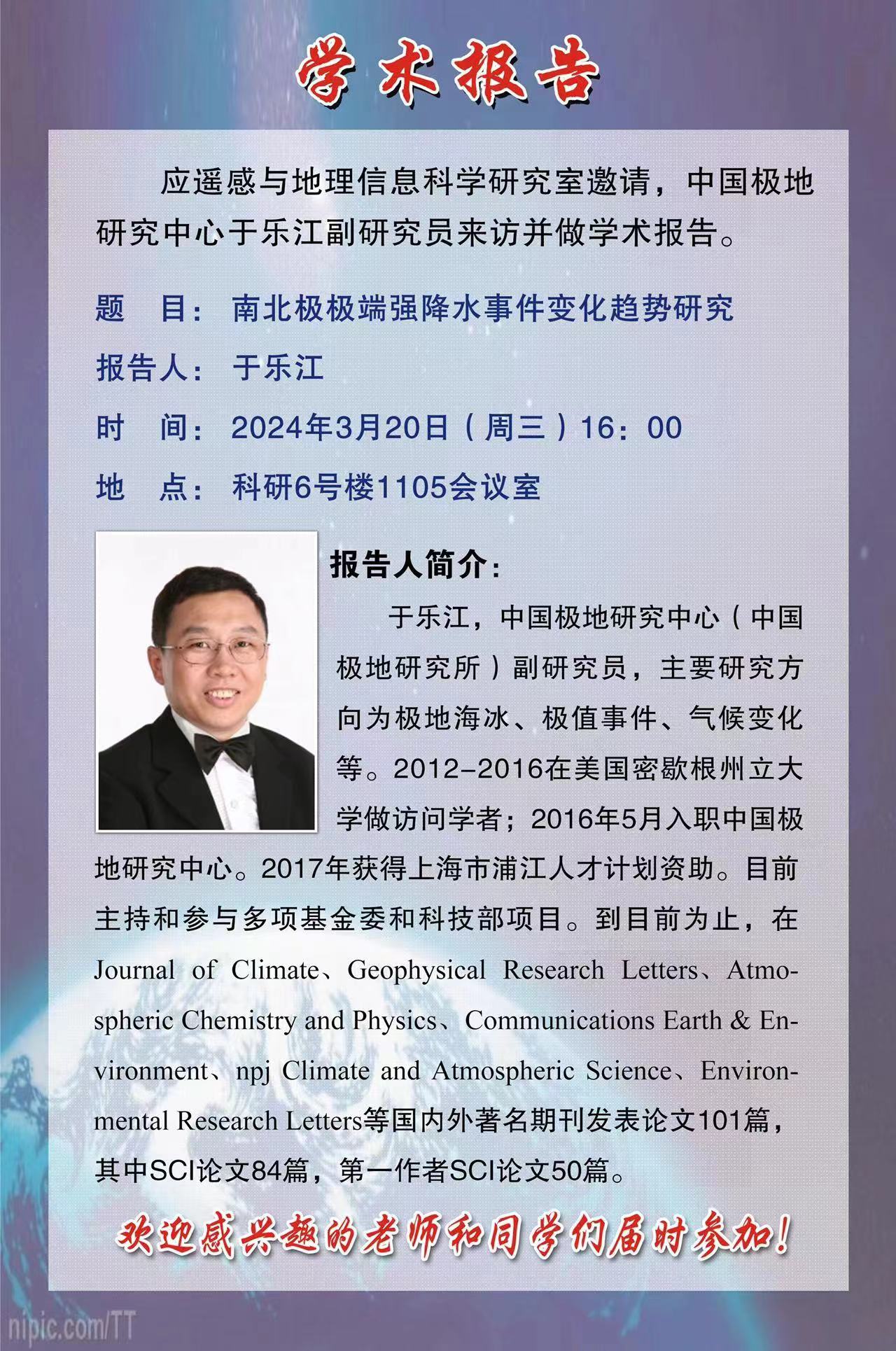 应遥感与地理信息科学研究室邀请,中国极地研究中心于乐江副研究员来访并做学术报告。