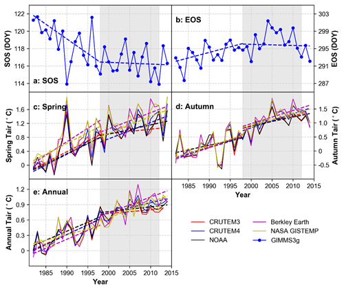 1982年至2014年期间北半球(纬度≥30°)物候期和温度的变化趋势。a是采用遥感估算的生长季开始时间(SOS)的变化趋势;b是采用遥感估算的生长季结束时间(EOS)的变化趋势;c 北半球春季平均温度的变化趋势;d北半球秋季平均温度的变化趋势;e全球陆地平均温度变化趋势。遥感物候估算采用了五种常用的物候估算模型,图a和b中是五种模型的平均值。温度数据选取了五套IPCC报告中用于评价全球变暖的数据集,分别是CRUTEM3.0、CRUTEM4.6、NOAA、 Berkley Earth和 NASA GISTEMP。图中虚线表示采用Mann–Kendall方法计算的线性趋势。图中灰色阴影部分表示Warming Hiatus时段。