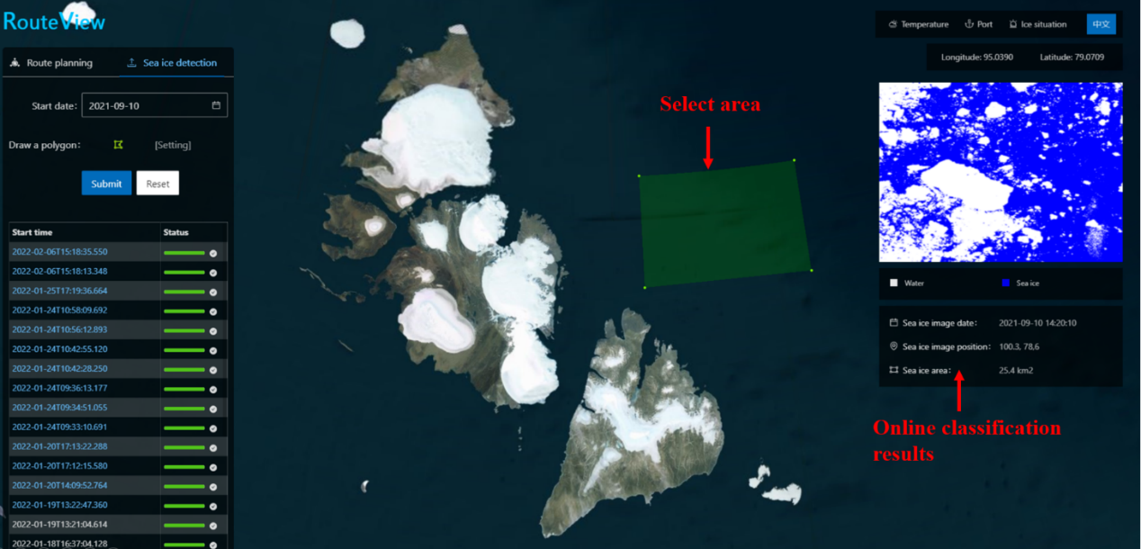 中国科学院西北生态环境资源研究院(以下简称“西北研究院”)车涛研究员团队基于地球大数据云平台,开发了一个在线可交互的航线智能规划系统(RouteView),为北极船舶航行提供短-中期规划,进一步提升北极通航信息服务水平。RouteView从两个方面突破北极航道信息服务的智能化水平:(1)在深度强化学习支持下,可计算不同条件约束下未来60天最优航线分布。(2)基于U-Net深度学习模型,实现北极局部地区海冰和海水在线自动分类。相比已有北极信息服务系统,RouteView能够实时处理海量数据,能够规划出时效性更高、更为安全经济的航线,从信息提取方式和计算效率等方面提高了北极航道信服服务的智能化水平,对“冰上丝绸之路”发展提供一定的决策依据。
